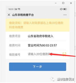 2.保障家庭通过微信或支付宝扫描交款二维码,手机界面跳转到山东非税统缴平台,输入20位缴款码进行缴款(缴款码向财务人员索要)。