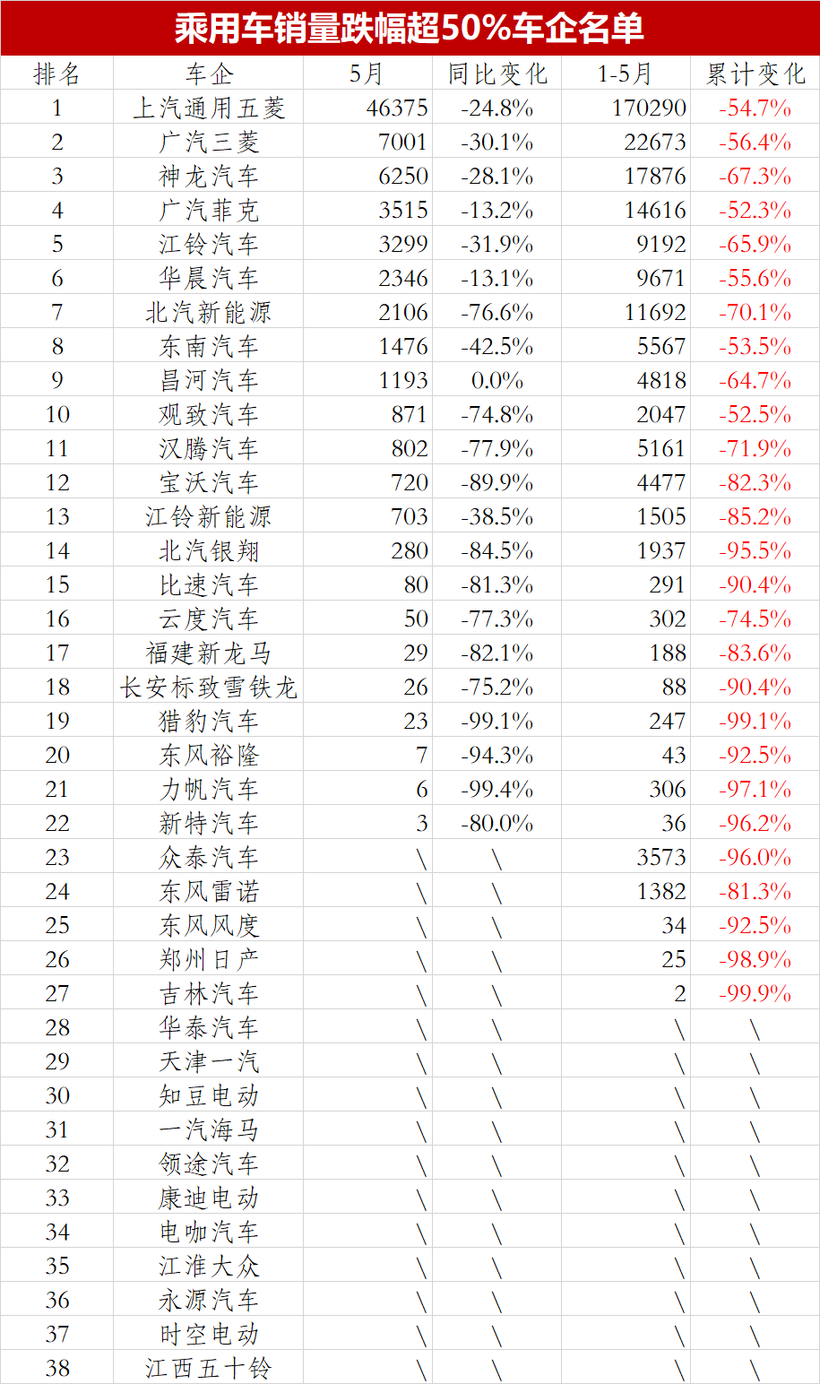 根据乘联会数据统计,今年前五月销量跌幅超50%车企名单中,共有38家车企上榜。其中包括广汽三菱、神龙汽车、广汽菲克等8家合资车企,其余均为自主企业。