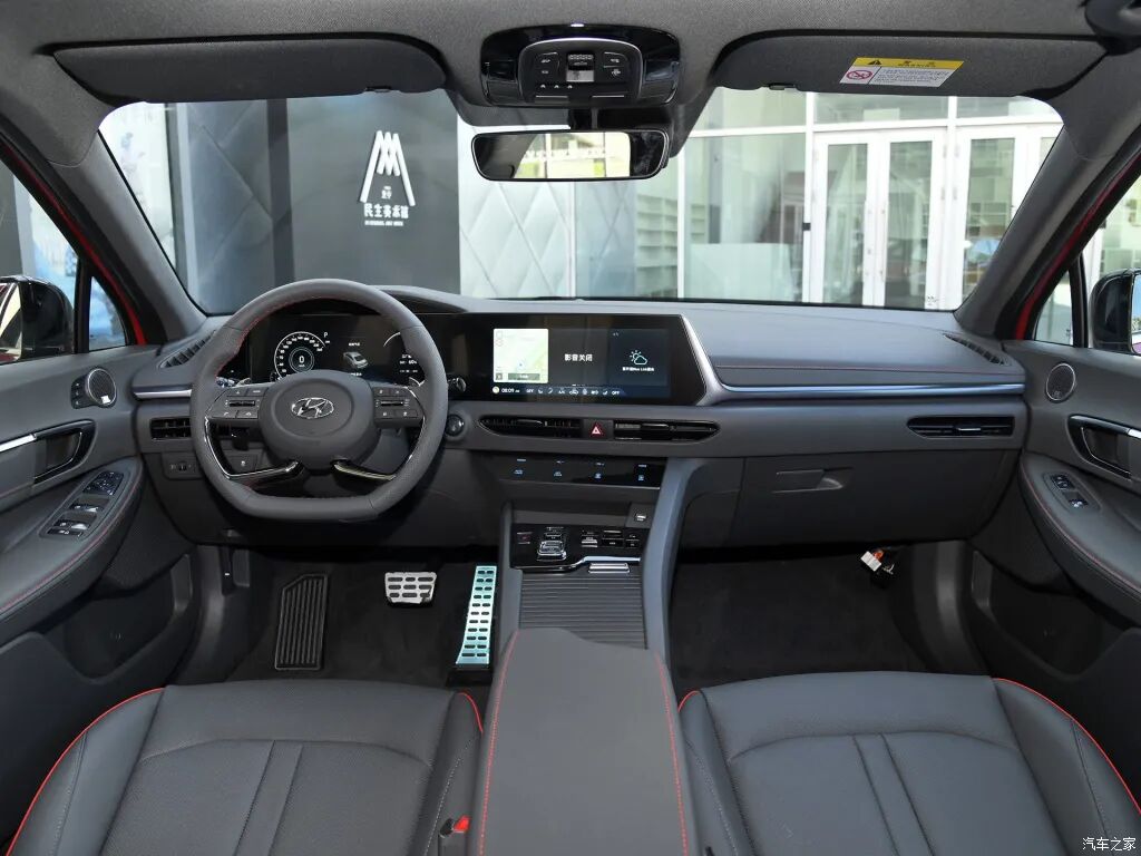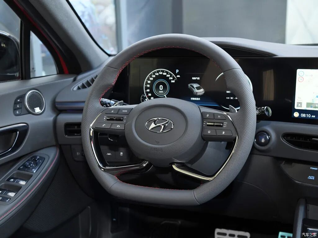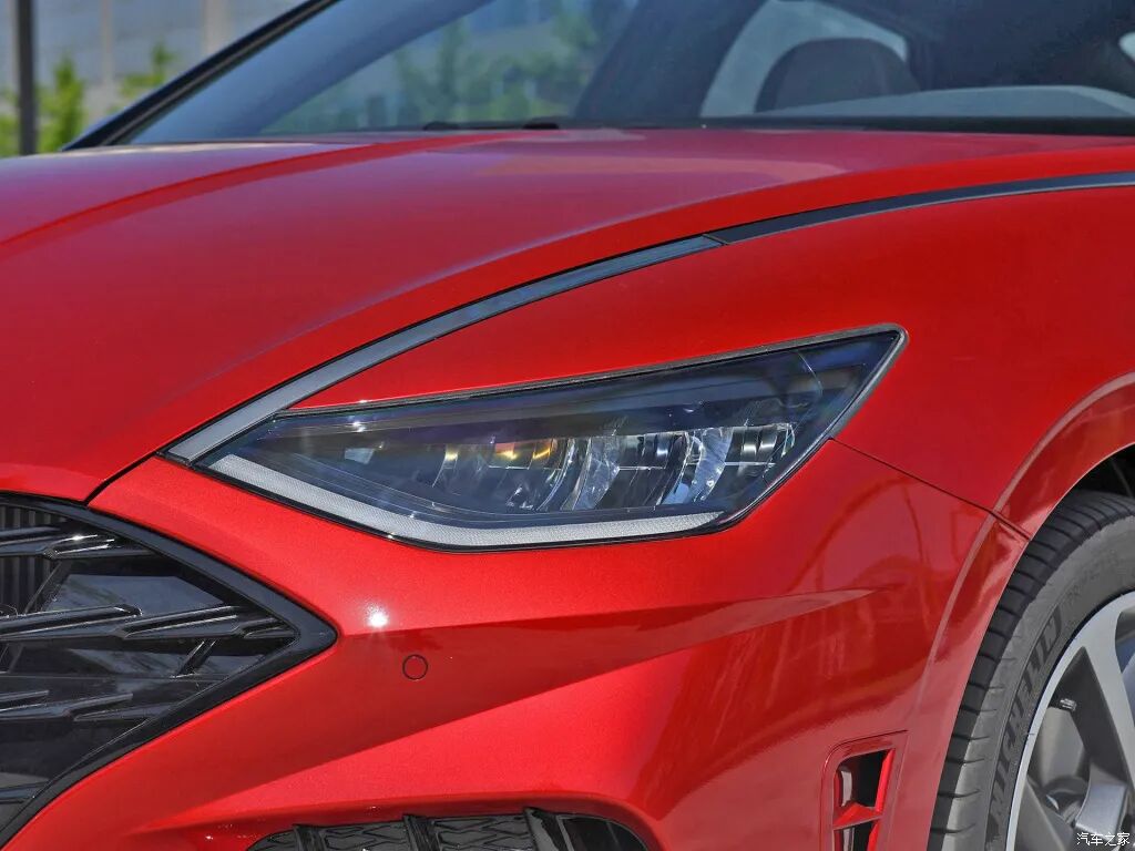 先来简要回顾一下车型的静态表现。第十代索纳塔采用了现代最新的Sensuous Sportiness设计理念,视觉效果极富冲击力。六边形的进气格栅尺寸巨大,内部的横向饰条也采用了黑色烤漆涂装,不但与鲜亮的红色车身形成对比,运动感也更为强烈。