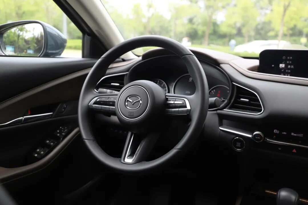 CX-30车内的人机工程学做的很不错,这也符合马自达一贯的追求,那就是让驾驶者能够舒适地操控车辆。虽然这是一台SUV,但实际感觉坐姿也较低,很有运动范。方向盘采用真皮包裹,上面集成了多媒体、自适应巡航等多功能按键,后面还配备换挡拨片。