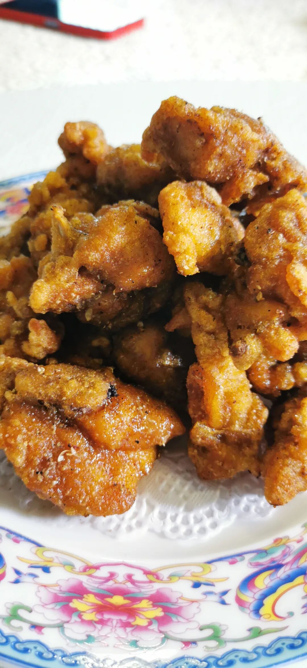 炸小鸡和炸排骨最好用花生油一般在160度下锅,高温不超过180度,鸡块炸的时候从边上一点点慢慢的溜进去,不容易沾在一起,油不容易溅锅,第一遍炸好用吸油纸它按一下,经过二次复炸用吸油纸处理之后里面的水分就激发出来了,博山炸小鸡马上出锅。炸小鸡炸好之后先控油,一边颠着一边撒上花椒面,炸小鸡的香气扑面而来。