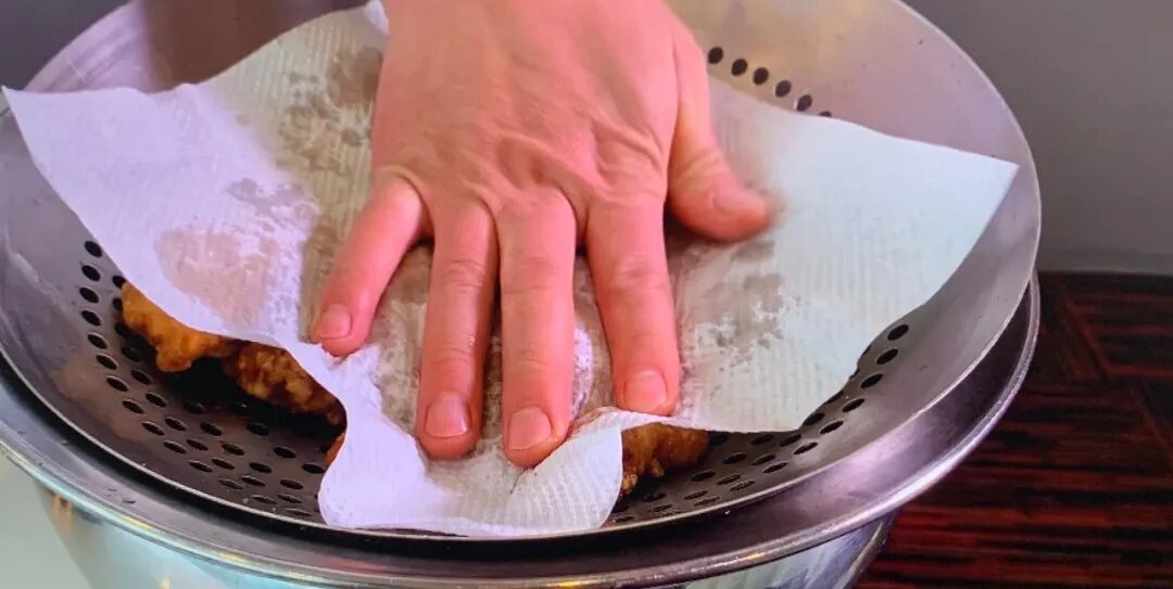 博山炸排骨讲究炸好之后两边的骨头一定要露出来炸了两遍还是延续刚才的技法,用吸油纸把肉全部按一下,让每一块排骨中间都要松散,排骨的肉要紧致一些,炸的过程一定要长一些,中间一定要炸三遍,炸小鸡可以炸两遍,一盆鲜香酥脆的博山炸排骨就炸好了。