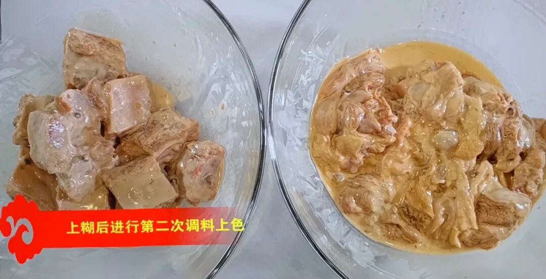 花椒面有讲究,必须用本土的香花椒配上才出博山炸货的味道,首先腌制的过程一定要把食材的水挤干净入味才透,依次加入三种调料,花椒,这一道菜放十五六粒,料酒放五到八克,最好用葱姜料酒,酱油一道菜大概在20到30克,放葱姜也是一种习惯,腌的时间控制在20分钟左右,不停的用手来抓一下,鸡肉和排骨腌好之后开始炸,糊一定要湿润不能太干。