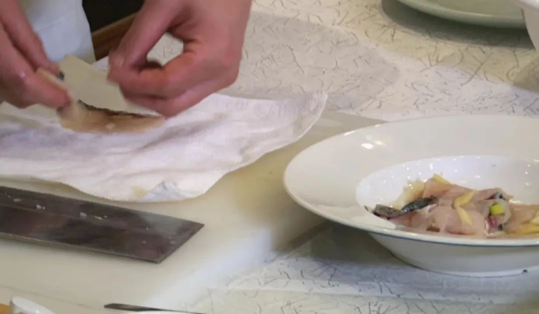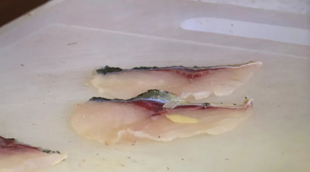 鲈鱼片成片,整个一分为二,沿着它的主骨贴刀切下来再片成薄片,加点葱姜、料酒、咸盐抓拌一下。拿个干净毛巾把鱼片吸一下,把里边的水分吸出来。
