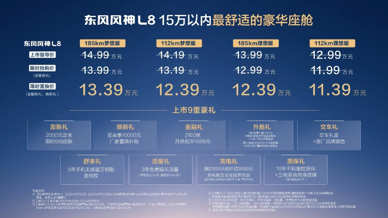 在第28届成都车展上,东风风神L8已正式宣布上市,限时置换价仅需11.39万元起(可叠加享受国/地补) ,这一极具竞争力的价格直接击穿“25万元才能配齐冰箱彩电大沙发”的行业认知,让其成为同级别中极具竞争力的舒享座舱之王。