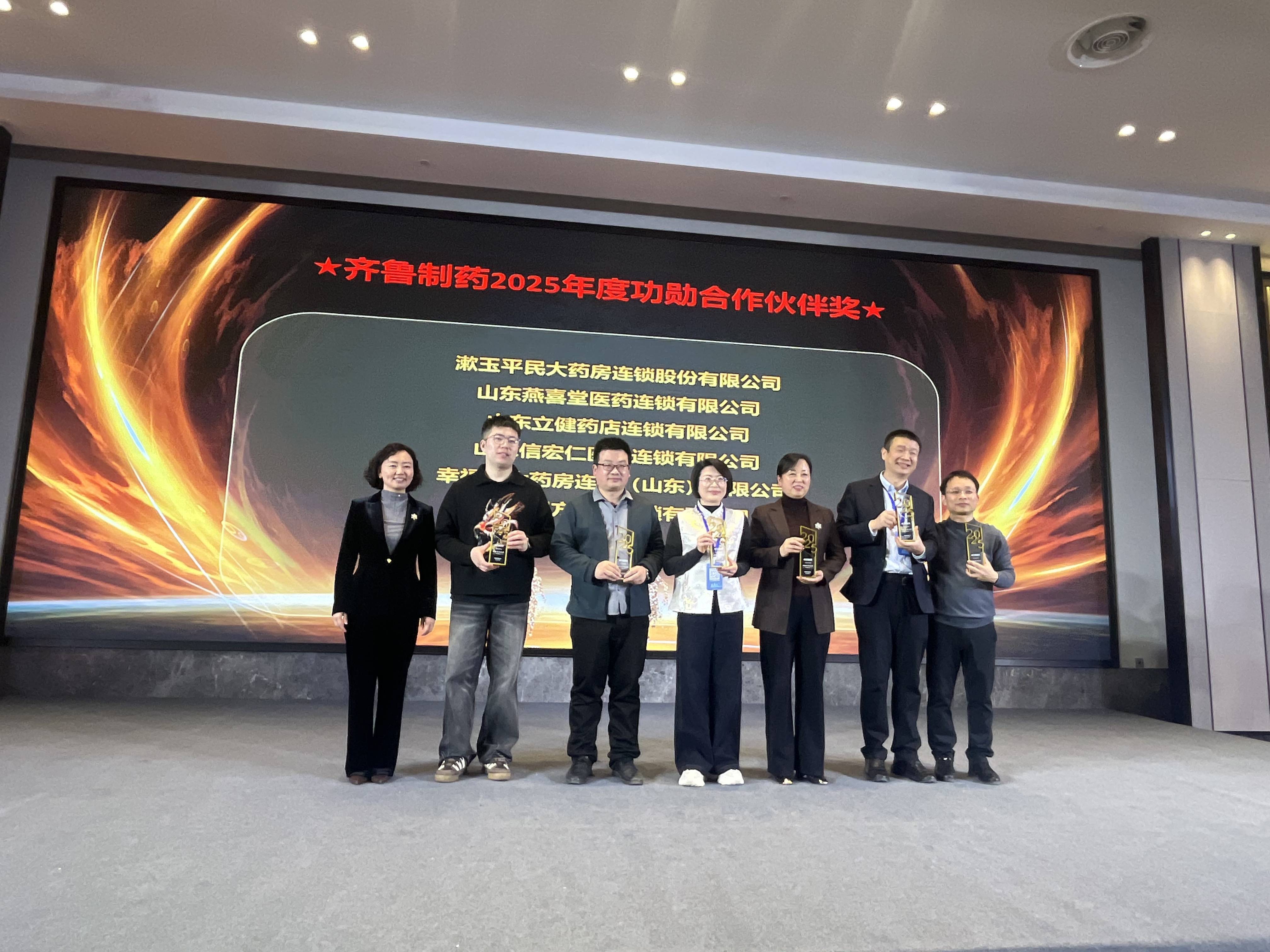 在表彰环节,张超董事长作为颁奖嘉宾为获奖者授奖。山东信宏仁医药连锁有限公司凭借卓越表现,一举荣获行业领军企业奖、年度诚信企业奖、年度先进企业奖三项大奖以及齐鲁制药2025年度功勋合作伙伴奖;张超董事长个人荣膺行业突出贡献奖,公司常务副总经理张亚峰获评年度影响力人物奖。此外,王丽丽、孙敏、孙国栋、邢绪杰、苏春霞等五位员工荣获“年度行业先进工作者”称号。