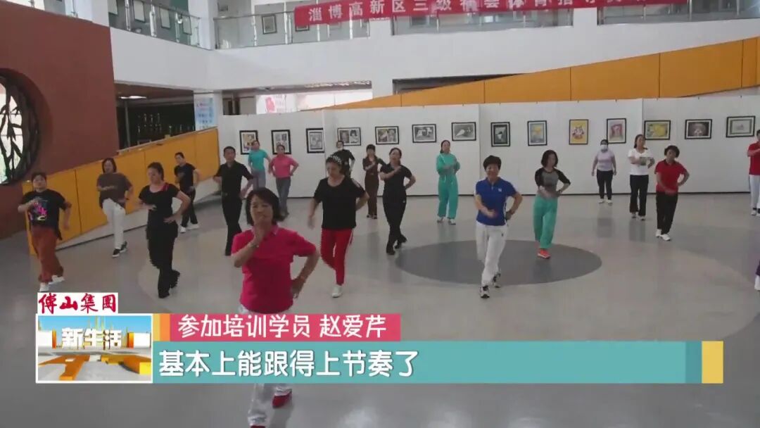 在高新区群众艺术馆也就是傅山村新时代文明实践站里,来自高新区各村居、社区的50余名学员参加了这次由淄博高新区教育和体育事业中心主办的三级社会体育指导员培训活动,授课老师针对舞蹈特点,耐心地将每个动作进行分解示范,对细节技能进行手把手教授。咱们的学员们更是态度认真,练习刻苦,很快就掌握了舞蹈要领,学会了《美丽中国》《幸福万年长》两个曲目。