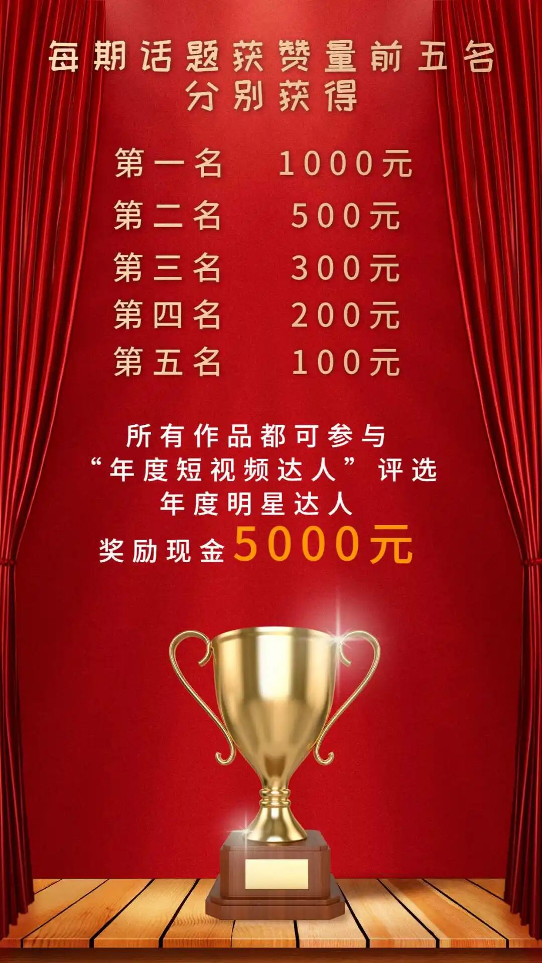 月(期)奖。每期话题设五个奖项。点赞量最多的前五名作品创作者为本期话题“短视频达人”,第一名奖励现金1000元,第二名奖励现金500元,第三名奖励现金300元,第四名奖励现金200元,第五名奖励现金100元。