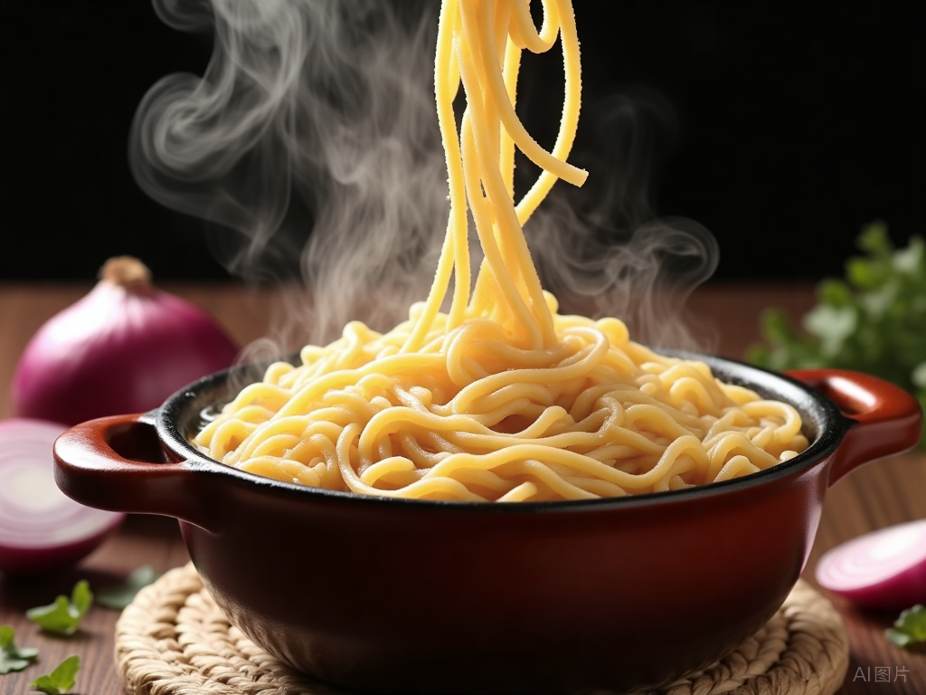 烤玉米则需要明火炭炉才能烤出它最本真的味道,与火焰接触的部分玉米粒“开花”,表层烤焦,但玉米粒的内里依然鲜嫩,散发出的香气更是引人垂涎。还有一种不剥去苞叶的烤法,可以避免玉米粒被烤焦,吃起来不会过于干硬。 图源:AI生成 从棒子上脱掉的玉米粒,既能做主食,也能做菜。整颗玉米粒熬粥,在东北叫“大碴子粥”,通常还要加入红芸豆一起熬煮,配上蘸酱菜、咸菜,吃起来清清爽爽。甜嫩多汁的新鲜玉米粒质地不逊于嫩豌豆,既能炒肉丁、炒胡萝卜丁、炒松仁,也能拌入肉馅包饺子,有着特别的清香滋味。 图源:AI生成 玉米磨碎后,虽然不像面粉的可塑性那么强,也能做成美食。玉米面窝窝头曾经是穷困时的主食,现在成了减脂餐。玉米面贴饼子通常在乱炖菜、炖杂鱼的大锅边贴一圈,在热气的作用下玉米饼迅速凝固,吸收菜香后更加诱人。 图源:AI生成 西南地区的“苞谷粑粑”用嫩玉米粒磨成浆,捏成长条状,用玉米苞叶包起来蒸熟,散发出“本是同根生”的清香,绵软清甜。 图源:AI生成 玉米粉很难直接擀成面条,直到现代才借助机器的作用,将玉米面经高温处理后,挤压成一根根坚韧的面条,因为原理很像钢锭压制钢丝,别名“钢丝面”。 图源:AI生成 东北以前有一种简易的玉米面条“酸汤子”,将玉米浸泡发酵后水磨成浆,滤干水分,和成较软的面团后,将特制的多孔模具架在开水锅上,按压出短粗的面条。但由于酸汤子发酵过程中可能会被椰毒假单胞菌污染,产生可以致命的米酵菌素,高温煮沸也不能破坏其毒性,现在已经不建议吃了。 图源:AI生成 从古老的美洲大陆走来,玉米既承载了悠久的历史,也点缀了今天的餐桌。值得回味的香甜中,蕴含着质朴的愿景。未来,它还将给人类带来怎样的惊喜?