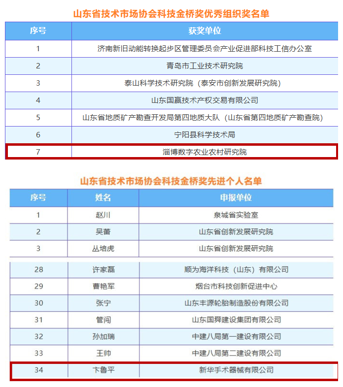 近日,2025年度山东省技术市场协会科技金桥奖授奖名单揭晓,由淄博高新区科学技术发展中心推荐,新华手术器械有限公司卞鲁平、淄博数字农业农村研究院分别获得山东省科技金桥奖“先进个人”和“优秀组织奖”。作为经省科技厅批准设立的山东省技术市场领域最高奖项,科技金桥奖旨在表彰在技术市场工作中贡献突出的集体、个人及成果转化项目。此次高新区两家单位获奖,既是对其在技术创新与成果落地方面的肯定,也是淄博高新区优化技术市场环境、推动科技与产业深度融合的体现。下一步,淄博高新区科学技术发展中心将持续秉持"促进技术市场繁荣"的理念,进一步优化科技成果转化生态,不断提升科技创新能力与成果转化效率,为高新区技术市场高质量发展蓄能加力。