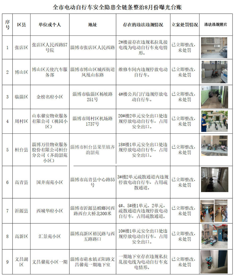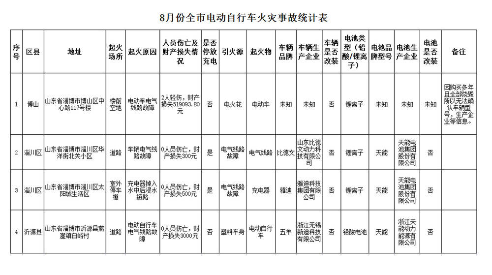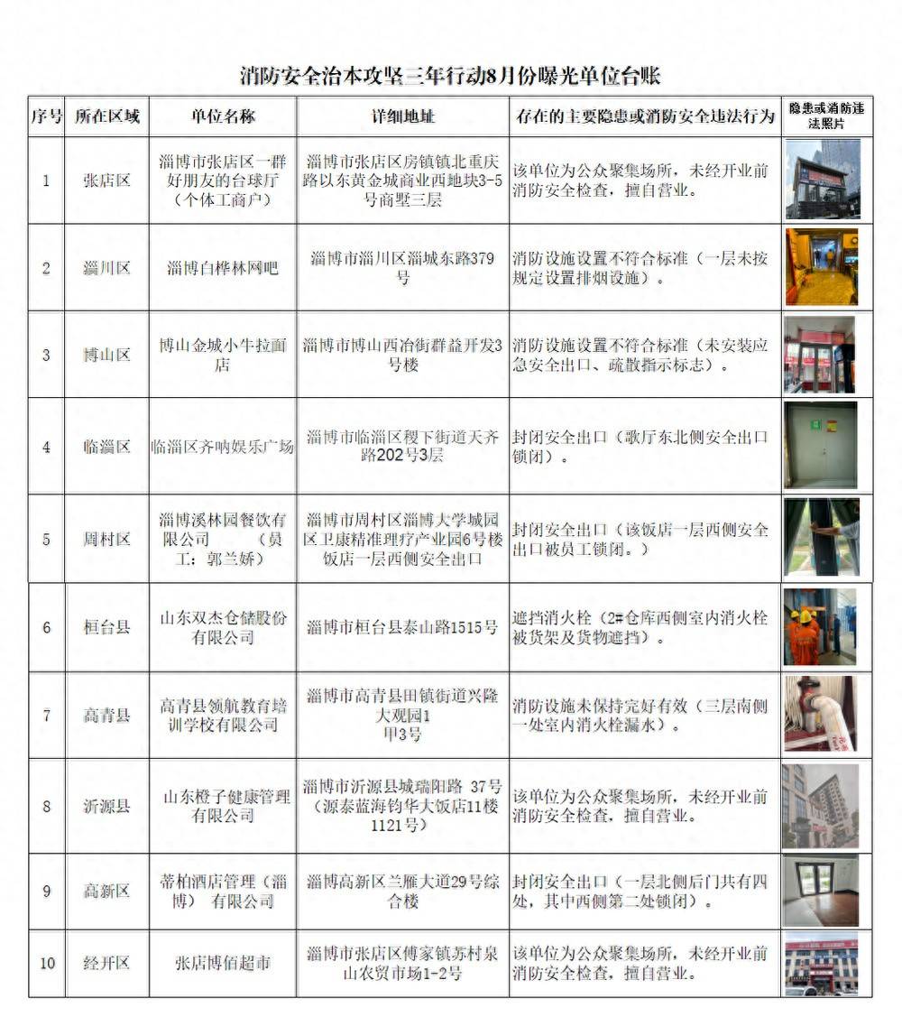 8月27日,淄博市消防救援支队发布全市消防安全治本攻坚三年行动8月份曝光单位台账,对10家火灾隐患、消防违法行为突出单位或个人开展集中曝光;同时发布全市电动自行车安全隐患全链条整治8月份曝光台账,对9家单位存在的电动自行车违法违规情况开展集中曝光;并对全市电动自行车8月份火灾事故开展集中曝光。