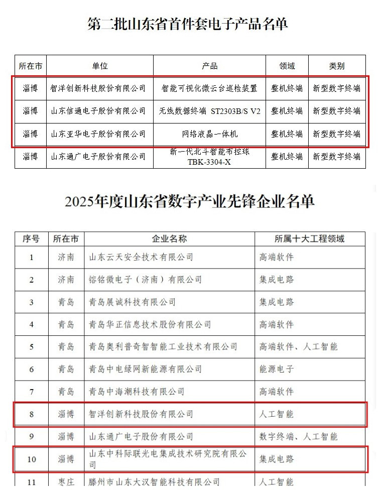 近日,省工业和信息化厅公布2025年度数字产业先锋企业及第二批首件套电子产品认定名单。其中,淄博高新区企业智洋创新科技股份有限公司、山东中科际联光电集成技术研究院有限公司成功获评“山东省数字产业先锋企业”;智洋创新科技股份有限公司、山东信通电子股份有限公司、山东亚华电子股份有限公司的三项产品荣获“山东省首件套电子产品”称号。此次多家高新区企业斩获省级荣誉,不仅是对企业自身创新实力的高度认可,更集中体现了高新区在推动数字产业创新发展方面的显著成效与强劲活力。