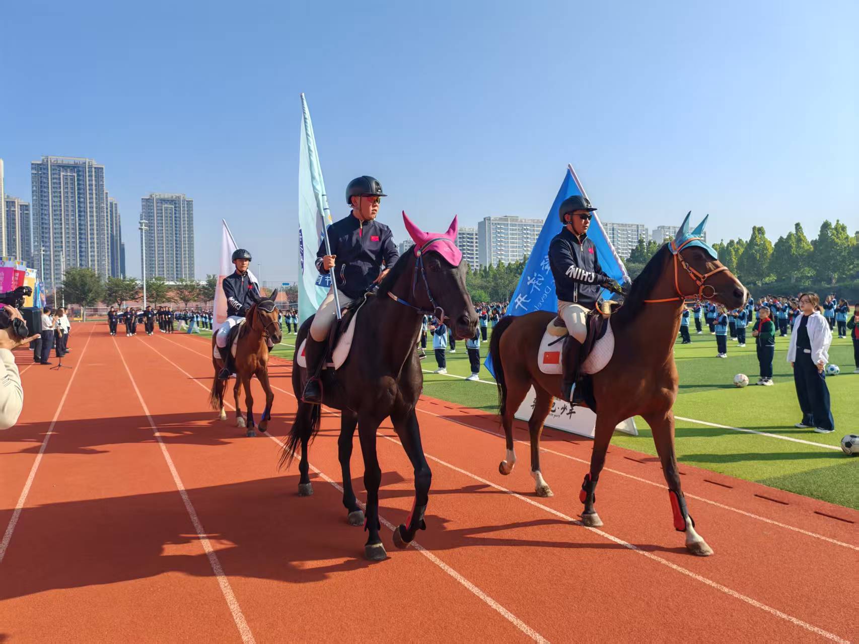 开幕式上,来自全区各中小学的代表队踏着激昂的运动员进行曲依次入场。小学部学生的跳绳操和足球短传表演节奏铿锵、气势昂扬,马术俱乐部的多人马术展示更是赢得在场观众的阵阵喝彩,成为开幕式上的亮眼风景。