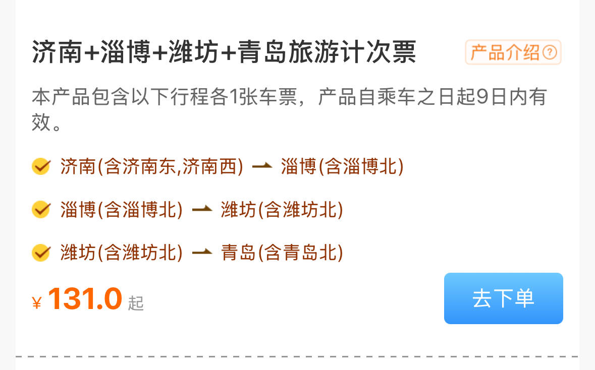 4条线路设计满足多种旅游需求。本次推出的旅游计次票产品是精心设计的4条暑期热门旅游线路的组合。其中“济南+青岛+烟台” 旅游计次票包含济南(济南东/济南西)至青岛(青岛北)、青岛(青岛北)至烟台(烟台南)、烟台(烟台南)至济南(济南东/济南西)各1张二等座车票。“济南+曲阜+泰安” 旅游计次票包含济南(济南东/济南西)至曲阜东、曲阜东至泰安、泰安至济南(济南东/济南西)各1张二等座车票。“济南+淄博+潍坊+青岛”旅游计次票包含济南(济南东/济南西)至淄博(淄博北)、淄博(淄博北)至潍坊(潍坊北)、潍坊(潍坊北)至青岛(青岛北)各1张二等座车票。“青岛+威海+烟台”旅游计次票包含青岛(青岛北)至威海(威海北)、威海(威海北)至烟台(烟台南)、烟台(烟台南)至青岛(青岛北)各1张二等座车票。
