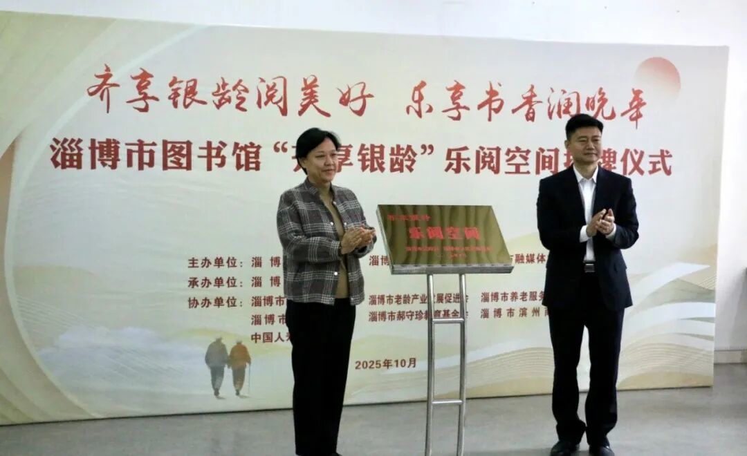 淄博市民政局党组副书记、副局长董玉磊与淄博市文化和旅游局党组成员、副局长陈少勇共同为“齐享银龄”乐阅空间揭牌,标志着这一老年专属阅读空间正式向公众开放。