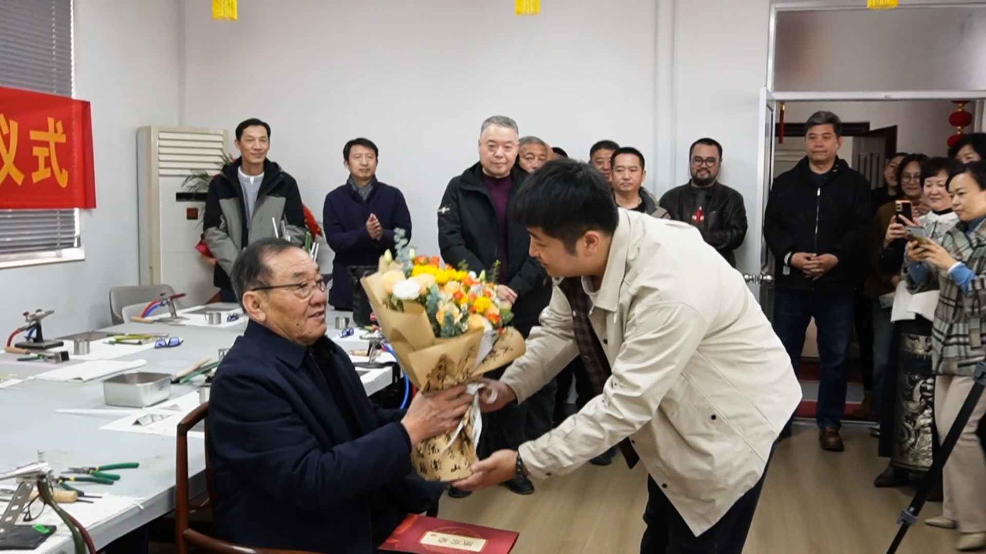拜师仪式开始后,徒弟孙启烨首先向端坐的孙凤军大师敬献鲜花,并行传统拜师礼——敬茶、叩首。徒弟孙启烨表情难掩激动;师父孙凤军则面带微笑,眼神中充满期许。拜师环节依古礼进行。最后,孙凤军大师回赠拜师帖,正式接纳这位新弟子。这一递一接间,承载的是技艺传承的千斤重担。