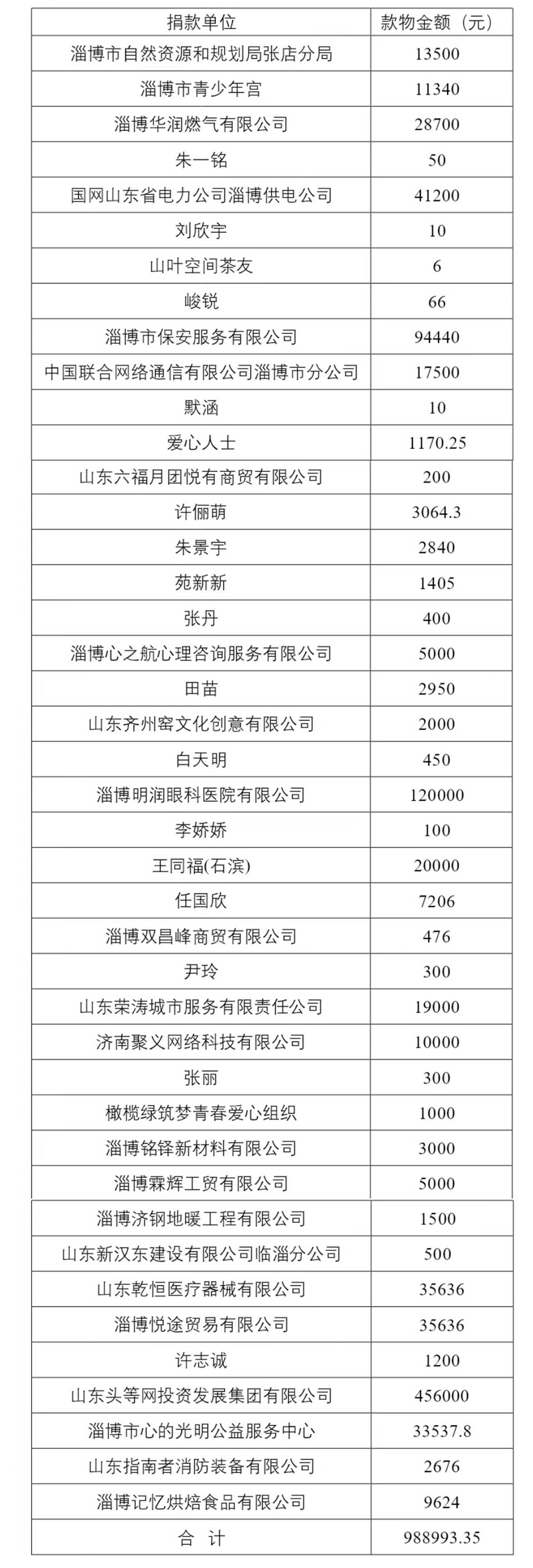 2025年8月6日,市民政局、市委社会工作部、市委市直机关工委、市总工会、市工商联、市国资委联合印发《关于开展2025年 “慈心一日捐”活动的通知》,在全市安排部署“慈心一日捐”活动。截止11月30日24时,淄博市慈善总会接收款物13091362.96元。其中,11月20日17时至11月30日24时接收款物988993.35元,现公示如下: