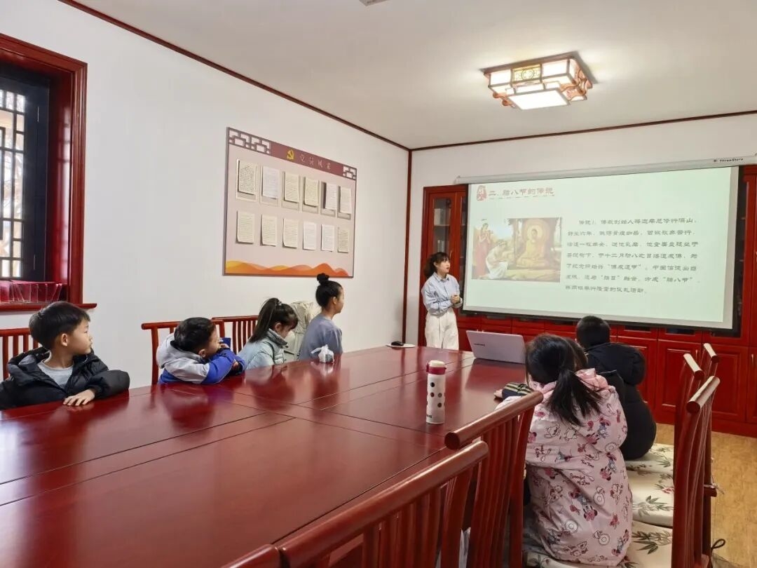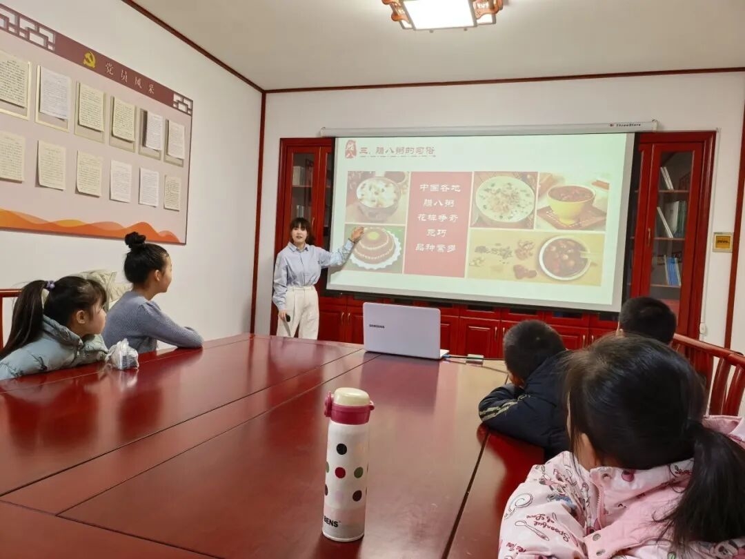 活动伊始,社教员以图文并茂的方式介绍了腊八节的历史渊源、传说及饮食习俗(腊八粥、腊八蒜)。