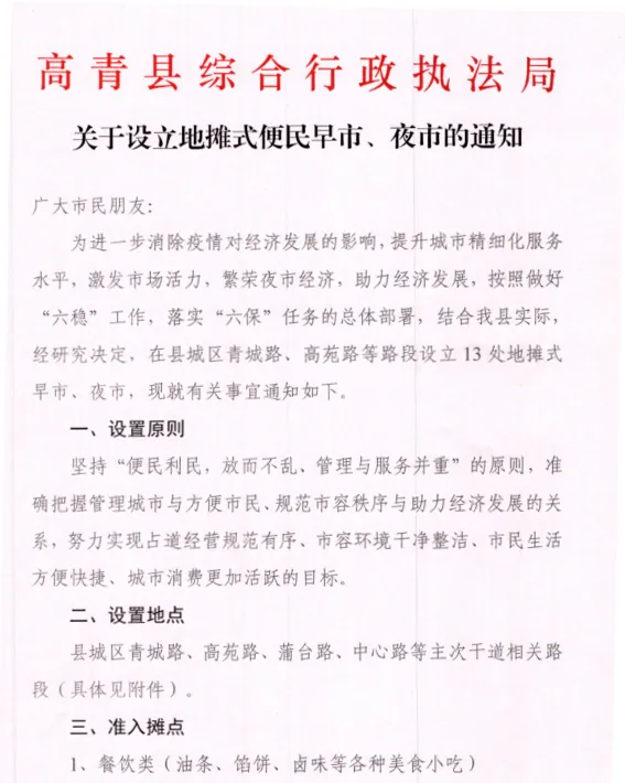 为了进一步消除疫情对我区经济发展的影响,提高就业率,更加方便市民群众生活,提升城市管理规范化水平,按照便民、为民、利民的原则,结合我区实际,在城区范围内设立部分便民早市夜市、“马路超市”和特色经营区域,现将有关事宜通知如下。以满足广大群众需求为目标,健全完善便民摊点长效管理机制;实现便民早市夜市、“马路超市”和特色经营区域的有序、便民、整洁、规范;遵循柔性执法和规范化管理原则,进一步促进城区市容市貌和文明卫生程度提升。城区范围内新建四路、秋泉路、泉水路、青龙山北路、五岭路、世纪广场、凤凰山广场、琉璃园等路段和区域(具体见附件),各镇街也要选择合适地点设立便民早市夜市和特色经营区域。(一)便民早市夜市、“马路超市”和特色经营区域管理1.对进入规定摊点群内经营的业户进行登记备案,对经营种类和范围进行筛选、规划和设定。2.便民早市夜市、“马路超市”和特色经营区域在起始路段的醒目位置设立标志牌,标明经营区域、开闭市时间、经营范围、管理制度、管理单位、管理责任人及投诉、监督电话等。4.经营范围内必须配备符合卫生标准的垃圾收集容器,采取经营业户自行保洁和路段卫生管理保洁相结合形式,确保经营区域内日常环境卫生保洁达到相关标准。5.禁止经营或销售国家明令禁止的和不符合国家标准的商品。6.对未进入便民早市夜市、“马路超市”和特色经营区域内的其他路段和区域,继续按照原有的市容管理标准和管理办法进行管理。(二)便民早市夜市、“马路超市”和特色经营区域固定经营业户管理1.须取得市场监管部门核准的经营资格证件,手续齐全,在统一位置进行明示,并符合市场监管部门相关要求。 2.摊位要求整洁、卫生,与周边环境相协调,摊位招牌、遮阳棚或摊位车等经营设施达到统一、美观、洁净。3.必须配备密闭垃圾桶,摊位周边保持干净整洁,无落地垃圾杂物。4.现场食品加工经营业户必须配备防蝇罩等卫生防护设施,并达到相关部门要求;必须配备消烟除尘设施和地面防污用品(如地板革等),禁止产生油烟污染的餐饮和烧烤等经营行为。希望各位摊主熟知政策、互相告知,同时,也倡导广大市民朋友、机关、企事业单位给予大力支持,进市消费,广泛宣传,共同繁荣我区“夜市经济”和“市民经济”,引燃博山“烟火气”,助力全区大发展。