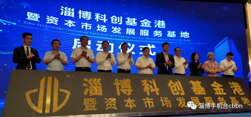 嘉宾代表吴苏、吕祥友、陈静、沈夕亮、董玉福、蔡承志、展恒浩和市领导于海田、尚龙江、马晓磊、盖卫星共同启动淄博科创基金港暨资本市场发展服务基地。