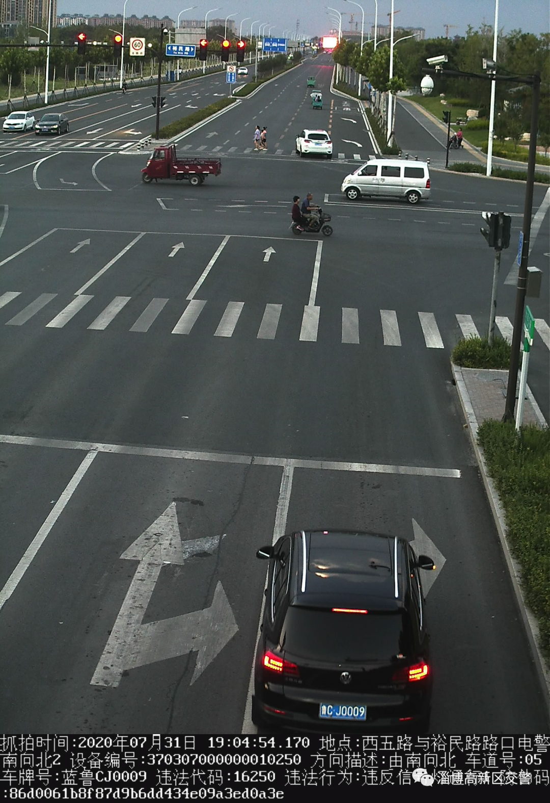 2020年7月31日19:04,鲁CJ0009在西五裕民路口违反信号灯规定。