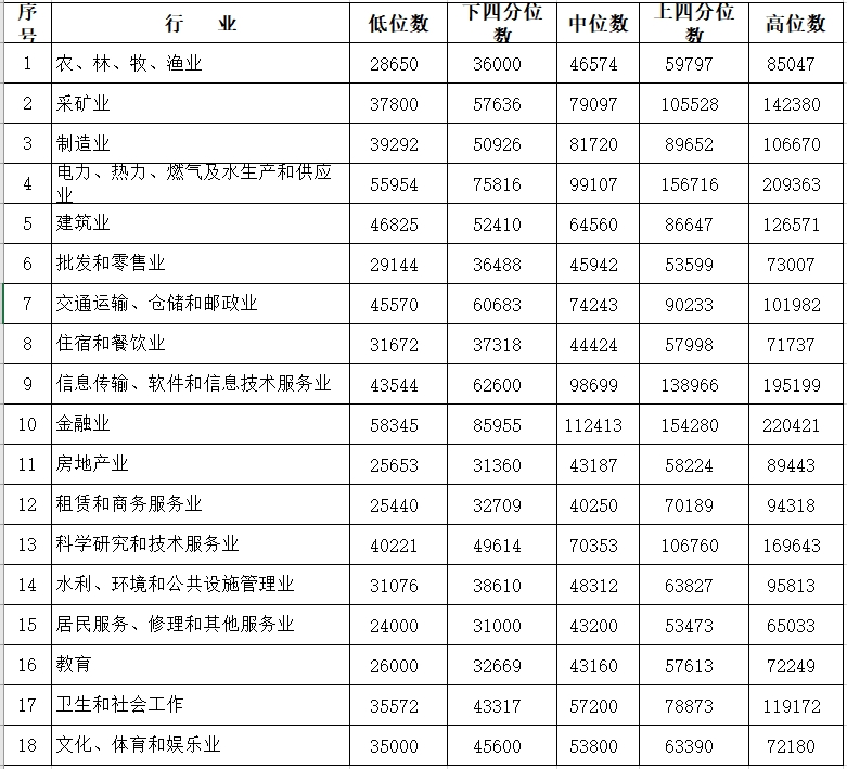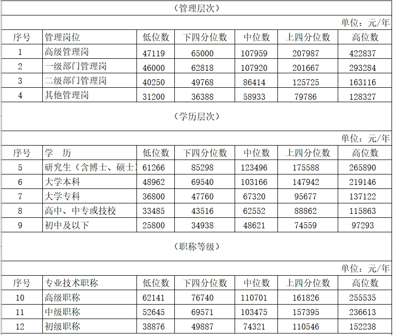 更好进行内部工资分配,现发布淄博市2023年人力资源市场部分职业工资指导价位和2022年企业人工成本数据,并就有关情况说明如下: 一、本次发布的工资指导价位和企业人工成本信息,是在对淄博市不同行业、规模、经济类型的553户企业、73542名职工2022年度薪酬调查的基础上,对调查数据进行汇总、筛选、整理、分析评估后获得的。 二、本次发布的工资指导价位分三类,一是按行业分类的工资指导价位18个(附件1);二是按管理层次、学历层次、职称等级和技能等级分类的工资指导价位17个(附件2);三是按职业分类的工资指导价位428个(附件3)。工资指导价位分低位数、下四分位数、中位数、上四分位数、高位数五个档次,调查样本数据从小到大排列,低位数为10%位置处的样本值,下四分位数为25%位置处的样本值,中位数为50%位置处的样本值,上四分位数为75%位置处的样本值,高位数为90%位置处的样本值。 三、企业人工成本水平和构成(附件4)从劳动报酬、保险费用、福利费用、教育经费、劳动保护费用、住房费用、其他人工成本7个方面呈现了淄博市43个行业553家企业的人工成本构成情况,可为各类企业人工成本管理工作提供参考。 四、工资指导价位是市场价格信息,不是政府制定的工资标准,其对人力资源市场价格的形成起指导作用。企业采取集体协商方式确定工资时,可参考政府部门发布的工资指导价位、工资指导线和人工成本水平等,根据本单位的经济效益状况和各职业岗位在本单位生产经营活动中所处的地位和作用,科学制定工资分配制度,形成合理的工资收入分配激励机制。 淄博市人力资源和社会保障局 2023年11月13日 淄博市2023年分行业 人力资源市场工资指导价位表