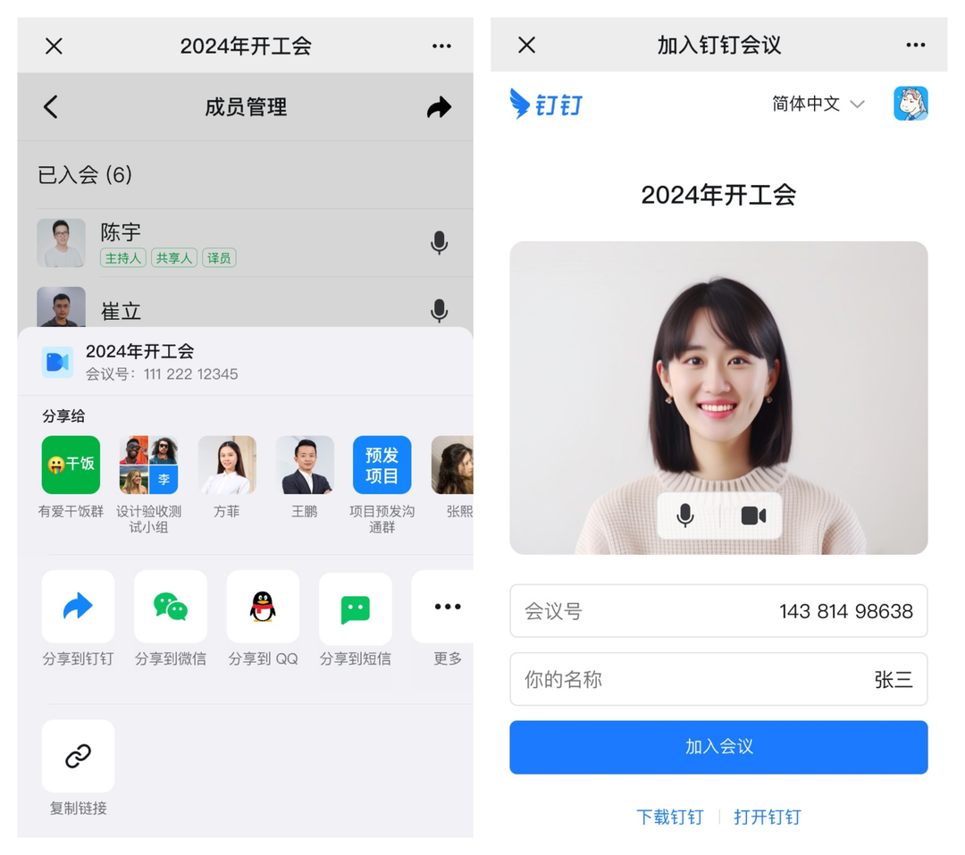 据了解,只需将钉钉会议的入会链接分享给微信好友,对方即可在微信内直接进入同一场会议。首次入会时需通过手机号进行验证,后续再次入会可实现一键快捷登录。而在此之前,当用户使用钉钉会议与外部人员进行远程会议时,对方往往需要先下载并注册钉钉APP才能参与会议,一定程度上影响了开会的即时性和便利性。