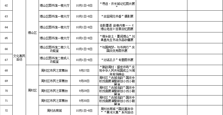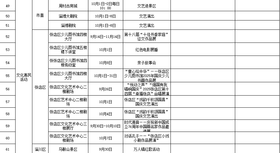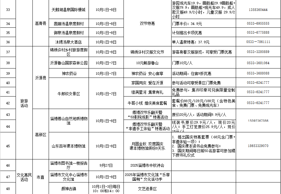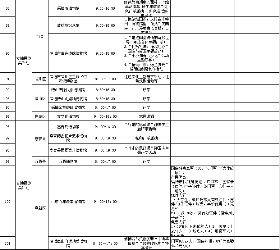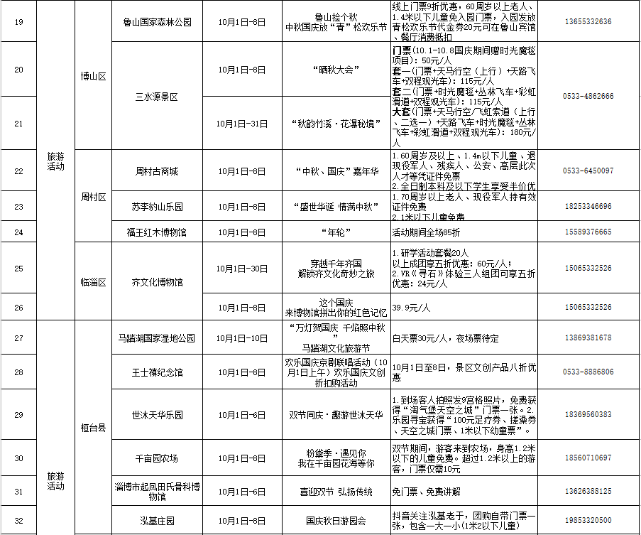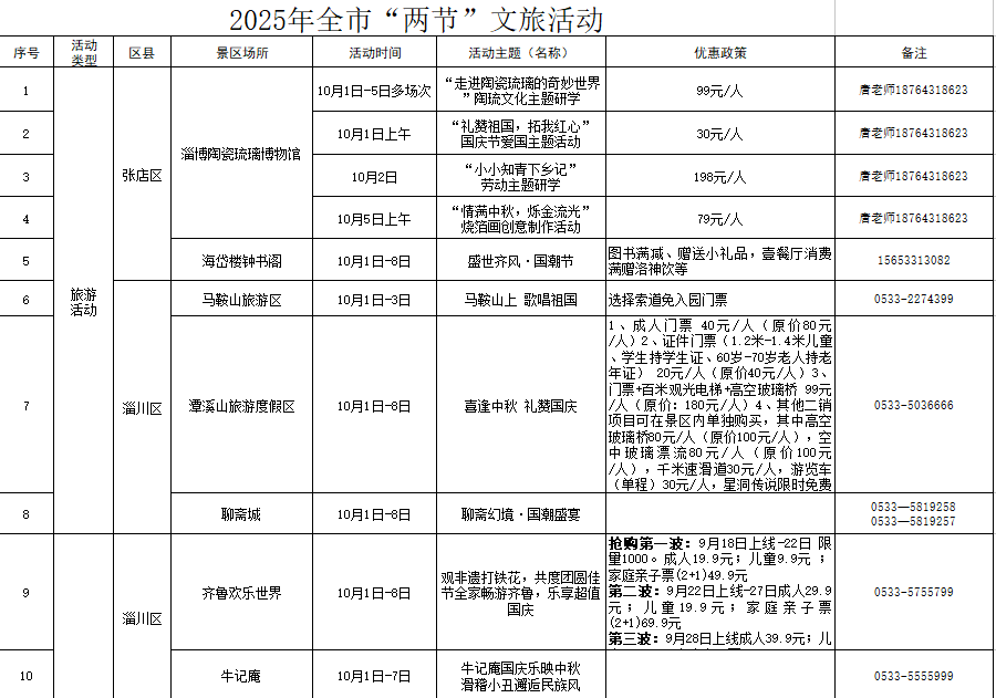 针对“两节”出游需求旺盛的特点,整合了全市优质文旅资源,推出四大特色产品,辐射全年龄段,满足不同游客出行需求。策划举办齐长城徒步、登高赏叶、滨水观鸟、采摘晒秋等40余场特色文旅活动。推出“齐艺传承之旅、智造体验之旅、遗存焕新之旅、醴香食光之旅”等4条工业旅游精品线路。“齐民要术——农耕酿术”“陶风琉韵——手造技艺”等6条研学线路,“齐艺烟火之旅、山水康养之旅、田园艺术之旅、温馨亲子之旅”等4条乡村旅游主题线路。组织开展中秋诗会、“清廉淄博·齐韵丹青”书画作品展、“歌颂祖国”红色电影展播、“寻迹·齐长城记忆”图片展、丰收节农民诗词大赛等展览展示活动50余场。开展“追光海岱楼·奇妙淄博夜”文艺快闪、“就在淄博城市艺术show”、迎国庆合唱展演比赛、“马鞍山上,歌唱祖国”红歌互动、《稷下学宫·百家争鸣》音乐剧演出等活动100余场次;组织专业院团于10月1日-3日每日10:00和14:00,深入到博山颜神古镇、周村古商城等景区开展文艺演出。