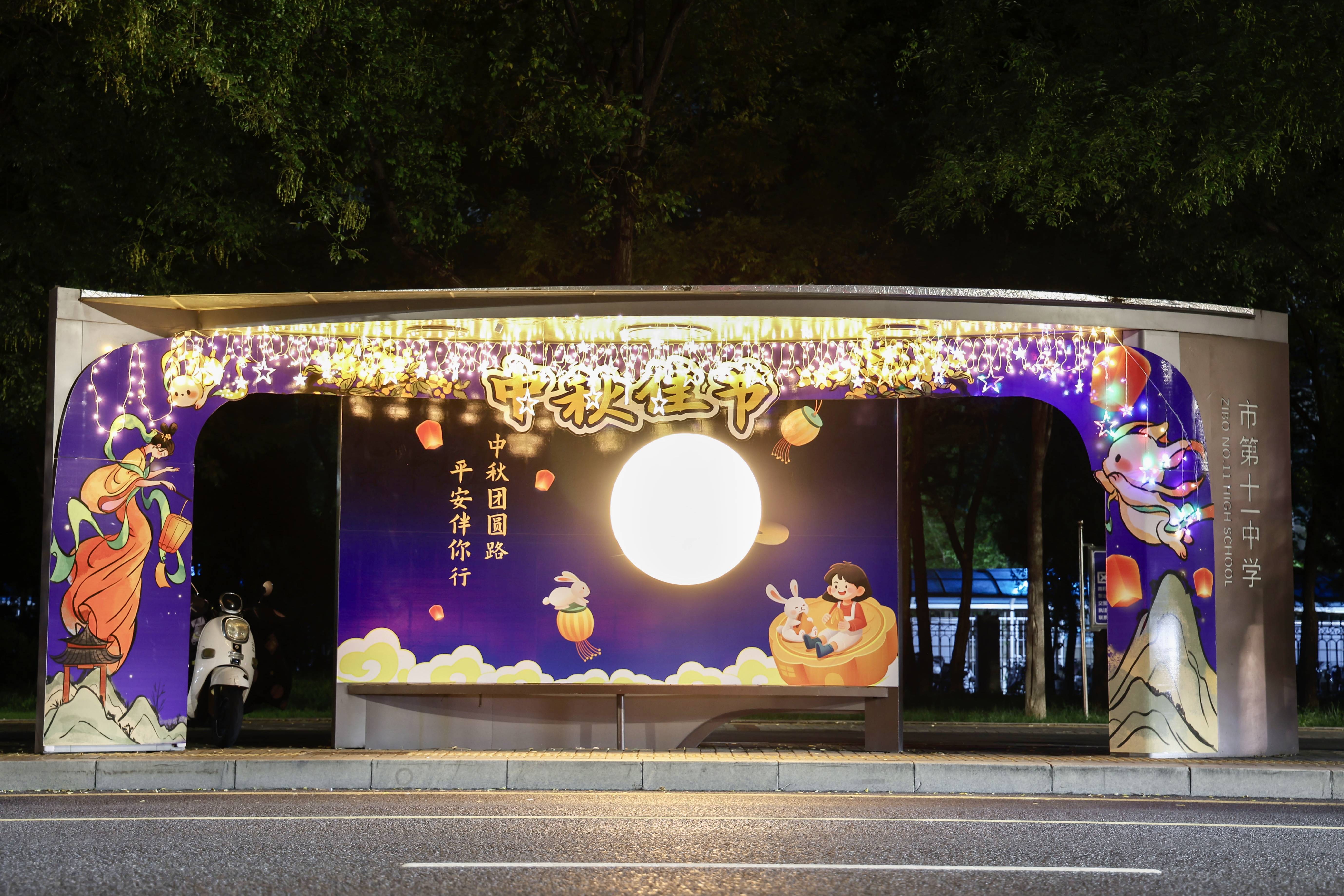当暮色渐沉、华灯初上,候车亭的灯光缓缓亮起:柔和的光晕勾勒出皎洁圆月的轮廓,垂坠的彩灯在光影间闪烁流转,整个候车亭宛如一座移动的“月光驿站”,将跨越时空的团圆之情娓娓道来。它恰似无声的信使,寓意着无论归途远近、身在何方,团圆的美好终将如约抵达,为等候公交的市民拂去旅途的疲惫,注入家的温暖。