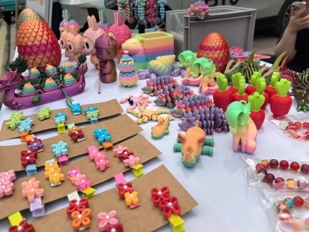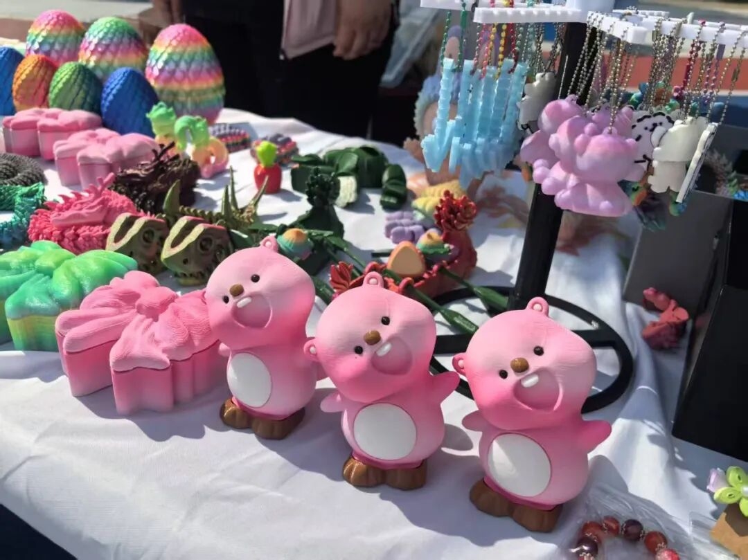 此次市集,南宿舍社区带来的是一件件承载着社区记忆与文化温度的作品。展台上,既有来自社区寒暑假儿童科普课堂的3D打印文创摆件、玩具,也有“我们的节日”主题活动中制作的精美手作,还有社区老年大学精心编织、雕刻的工艺品。