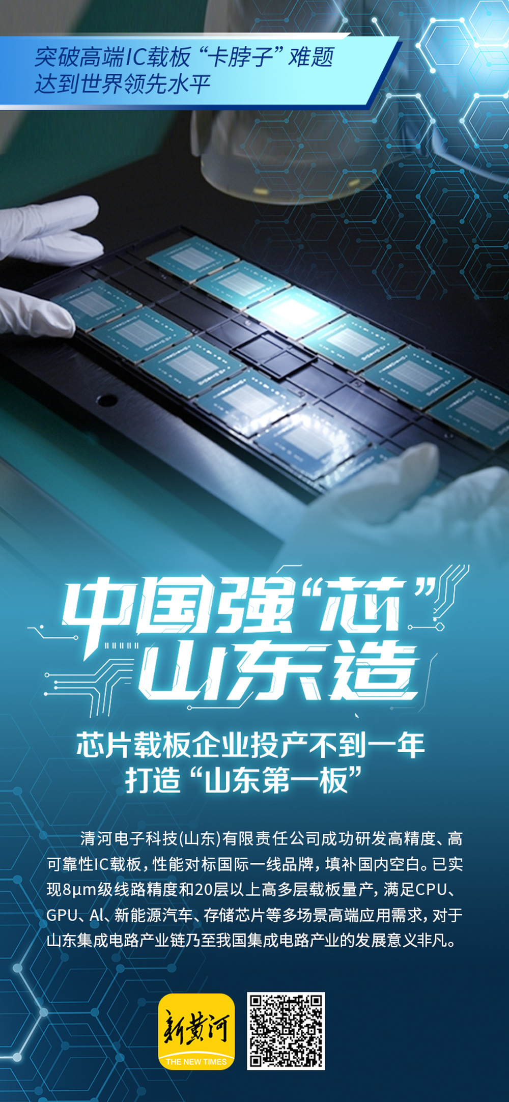 在济南,有一家芯片载板生产企业,投产不到一年,却已突破高端IC载板“卡脖子”难题,打造了“山东第一板”,助力用户终端产品的传输速率超出行业同等产品20倍,达到世界领先水平。这家企业就是清河电子科技(山东)有限责任公司(以下简称“清河电科”)。