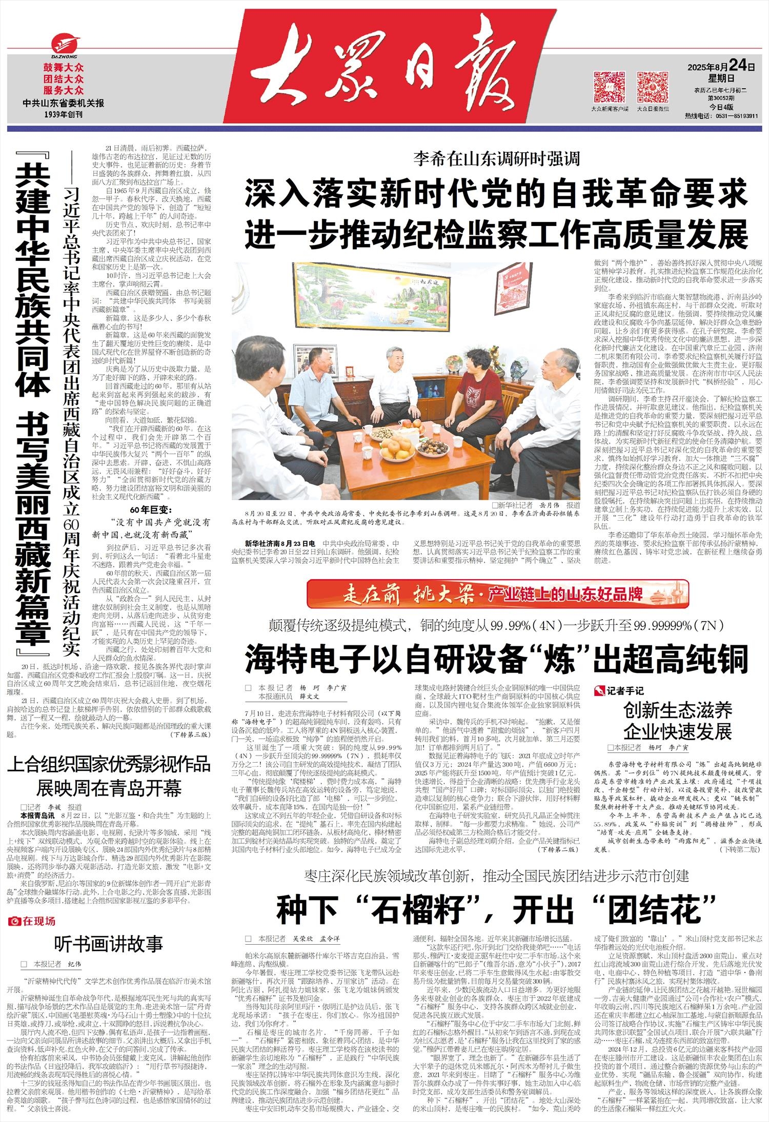 在企业展厅,一片泛着玫瑰金光泽、仅2微米厚的铜箔引人注目。“这是未来固态电池提升安全性的关键‘盔甲’之一。”魏传兵向记者比划着说,目前,海特电子不仅自建研发室,更携手中南大学、山东大学、东北大学等高校组建研发团队,以至纯“铜心”,持续熔铸中国“智”造品牌。