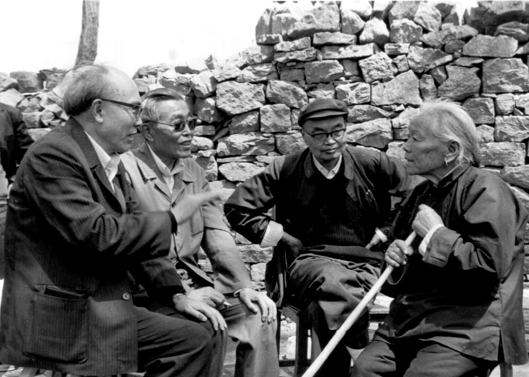 1985年5月,大众日报早期领导刘导生(左二)、匡亚明(左三)、陈沂(左一)重回创刊地云头峪村,看望冒死掩护过报社职工的房东大娘陈忠芳。