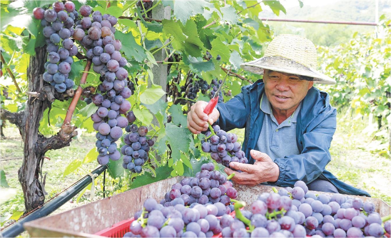 9月16日,威海环翠区一葡萄种植园,果农在摘葡萄。(□新华社发)