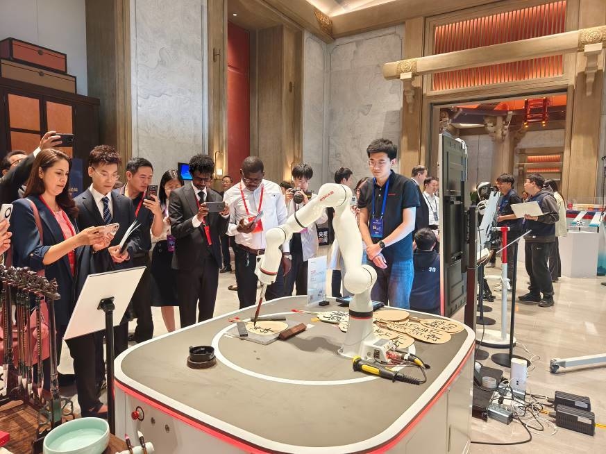 珞石书法机器人与赛飞特机器狗同台亮相。只需选定扇面内容,珞石书法机器人就可化身“书法家”蘸墨、运笔、挥毫,精准复现大师级笔迹,在行云流水间完成扇面题字,呈现“版权+工业”的创新成果。