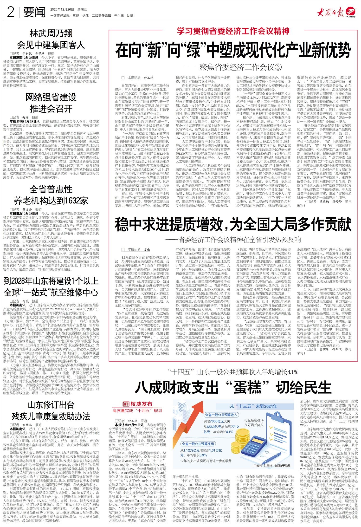 “会议对做好明年经济工作提出‘四个更加注重’战略安排,是立足新发展阶段、把握发展主动权的精准施策,也是塑强未来竞争新优势的前瞻布局。”山东社会科学院党委委员、副院长周德禄认为,“四个更加注重”抓住了全省经济工作的核心脉络,抓住了推动明年经济发展的“牛鼻子”,尤其是通过更为精准的产业优化升级推动培育增量与遏制减量协同发力,展现了工业大省“稳中求进”的责任担当,既为新兴产业、未来赛道注入活力,也为传统产业转型升级、困难行业纾困解难提供支撑,确保经济底盘稳固、新旧动能接续发力。而强调投资于物与投资于人协同发力,则凸显了人民至上发展理念的升华,通过进一步加强教育、科技、人才、民生等领域投入,为全省长远发展积蓄更加宝贵、更加持久的发展动能。